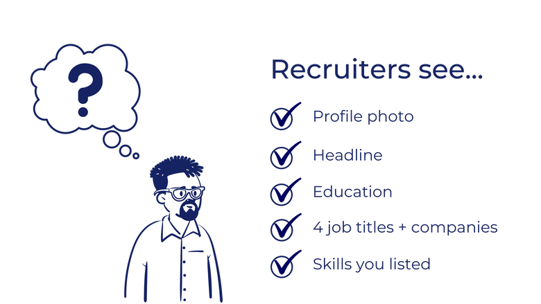 At first glance, all that's visible is your photo, headline, job title and company for your last four positions, education and any skills you've listed. Unless a recruiter clicks on your profile to find out more, they won't read your self-deprecating-yet-witty 'About' section or the detailed descriptions you wrote about your responsibilities in your current and previous roles.